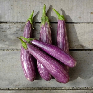 Cà tím sọc trắng là giống cà độc đáo với lớp vỏ tím pha trắng dạng sọc loang mềm mại, vừa đẹp mắt vừa giàu giá trị ẩm thực. Trái cà có thịt trắng mịn, vị ngọt thanh, mềm nhưng vẫn giữ độ giòn khi nấu, rất được ưa chuộng tại các bếp ăn gia đình và nhà hàng.