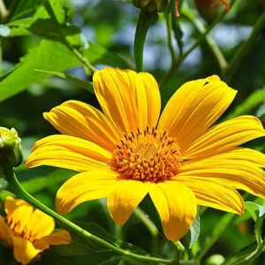 - Hạt giống hoa dã quỳ vàng cho cây thân bụi cao từ 1m đến 2m, lá xanh đậm xẻ thùy, tán rộng. Hoa to đường kính từ 6–10cm, màu vàng tươi, nhụy nâu đậm. Cây sinh trưởng khỏe, chịu nắng và khô hạn rất tốt. Càng trồng lâu, cây từ hạt giống hoa dã quỳ vàng càng phát triển vững chắc, ra hoa sai và đẹp quanh năm.