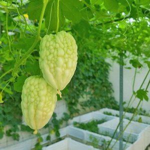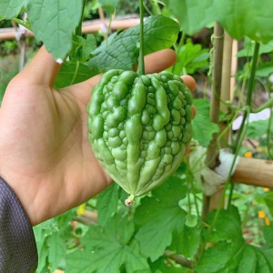 - Trái khổ qua có hình dạng đặc biệt giống trái tim, tạo điểm nhấn thú vị trong khu vườn.